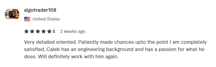 Here are some of my reviews on Fiverr. Feel free to check out my Fiverr profile here to read the rest of my reviews. I work hard to make sure that my customers are 100 percent satisfied with the finished product.
