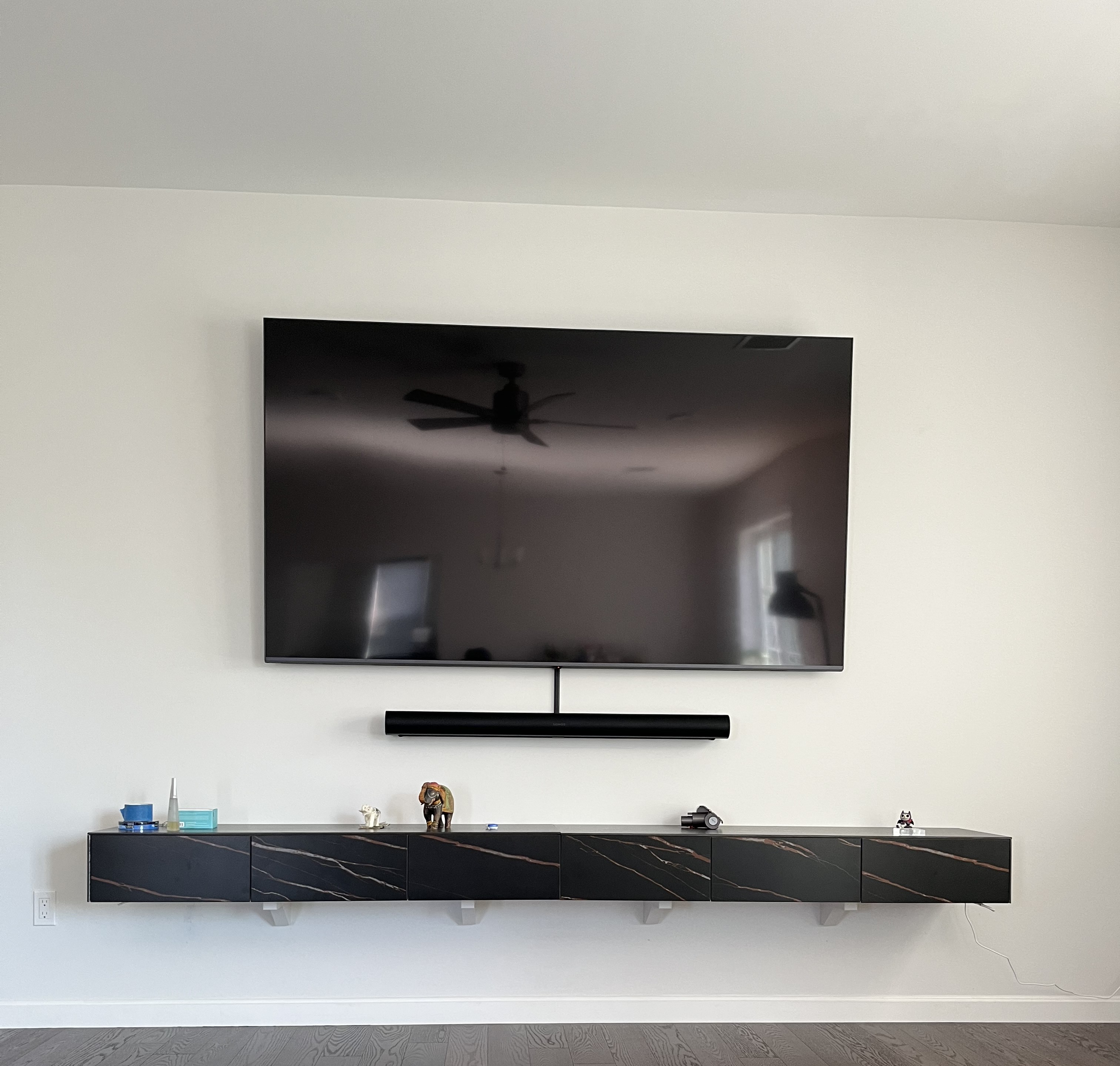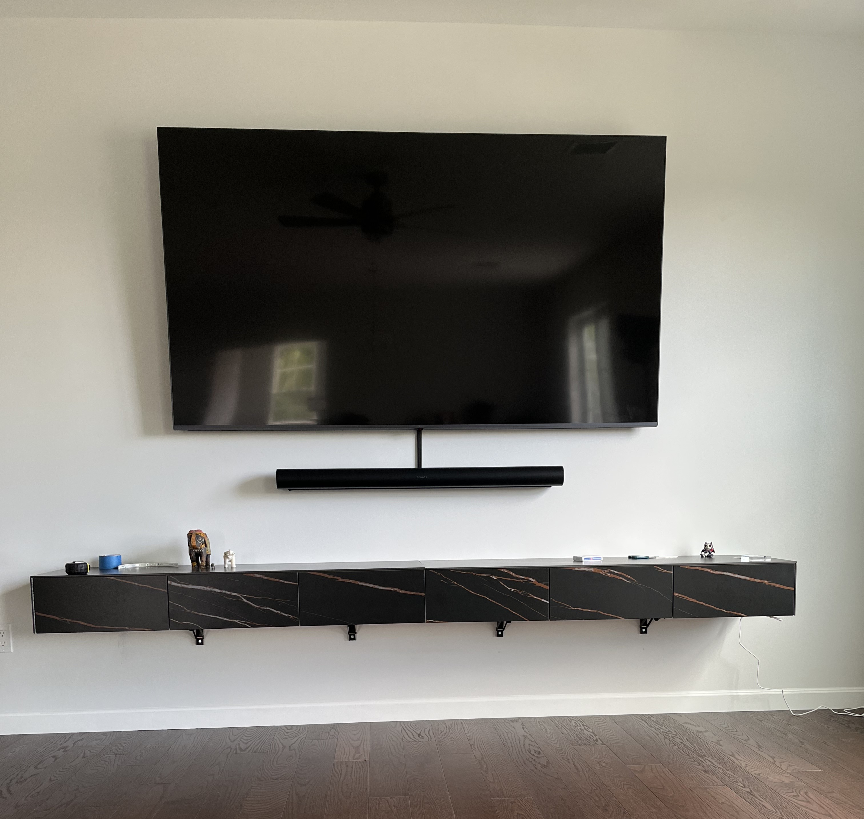 Have you ever installed some brackets for shelving and thought they looked really ugly? That’s what this client thought after they installed this new floating tv cabinet. The black brackets really stood out against the white wall and were a bit of an eye sore. They reached out to me to design a custom bracket cover that fits over each one blending in well with the wall. We painted the covers to match the color of the well and it blended in rather nicely. The covers are much less of an eyesore and really improved the look of the cabinet.